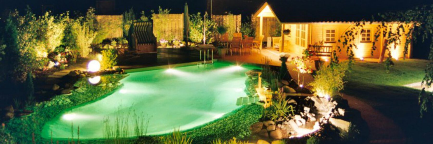 Es entstehen ganz neue Perspektiven und Eindrücke. Ein erleuchteter Pavillion lädt zum Verweilen ein. Wenn der Tag geruhsam ausklingt, gehören auch Lichtspiele im Wasser zu den schönsten Inszenierungen im TRAUMGARTEN. Interessante Lichteffekte entstehen, wenn ein Wasserfall oder aus einem Quellstein sprudelndes Wasser angestrahlt werden – oder wenn sich die Uferbeleuchtung nach Sonnenuntergang im Gartenteich spiegelt.